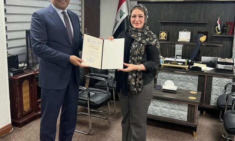 في مشهدٍ يعكس ريادة المرأة العراقية في مجال التعليم العالي تسلمت الأستاذ الدكتور إثمار عبد الحسين الشطري عميدة كلية التربية للبنات شهادة التميز من رئيس جهاز الإشراف والتقويم العلمي في وزارة التعليم العالي والبحث العلمي الأستاذ الدكتور صلاح هادي الفتلاوي وذلك تقديرًا لتحقيق أقسام الكلية المركز الأول على مستوى العراق في التصنيف الوطني للجامعات الحكومية والأهلية لعام ٢٠٢٥.
