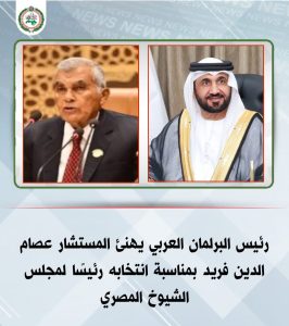 *رئيس البرلمان العربي يهنئ المستشار عصام الدين فريد بمناسبة انتخابه رئيسًا لمجلس الشيوخ المصري*