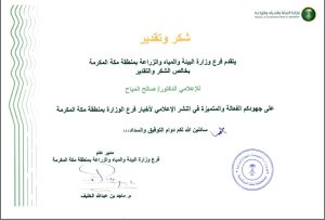 بغداد / كرمت وزارة البيئة والمياه والزراعة في منطقة مكة المكرمة رئيس الاتحاد العربي للإعلام الالكتروني الدكتور صالح المياحي بشهادة شكر وتقدير تثمينا لجهوده الاعلامية في تغطية أخبار الوزارة ونقلها بأسلوب احترافي مؤثر.