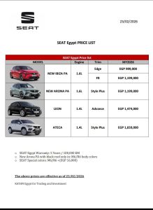 القاهرة، ٢٣ فبراير ٢٠٢٦: في خطوة استراتيجية تؤكد على قوة حضور عالمة “سيات” في السوق المصرية إلى جانب شقيقتها “كوبرا”، أعلنت شركة “كيان إيجيبت”، الوكيل الحصري للعالمتين، عن اإلطالق الرسمي لطرازي “سيات إبيزا” و”سيات أرونا” لعام 2026.